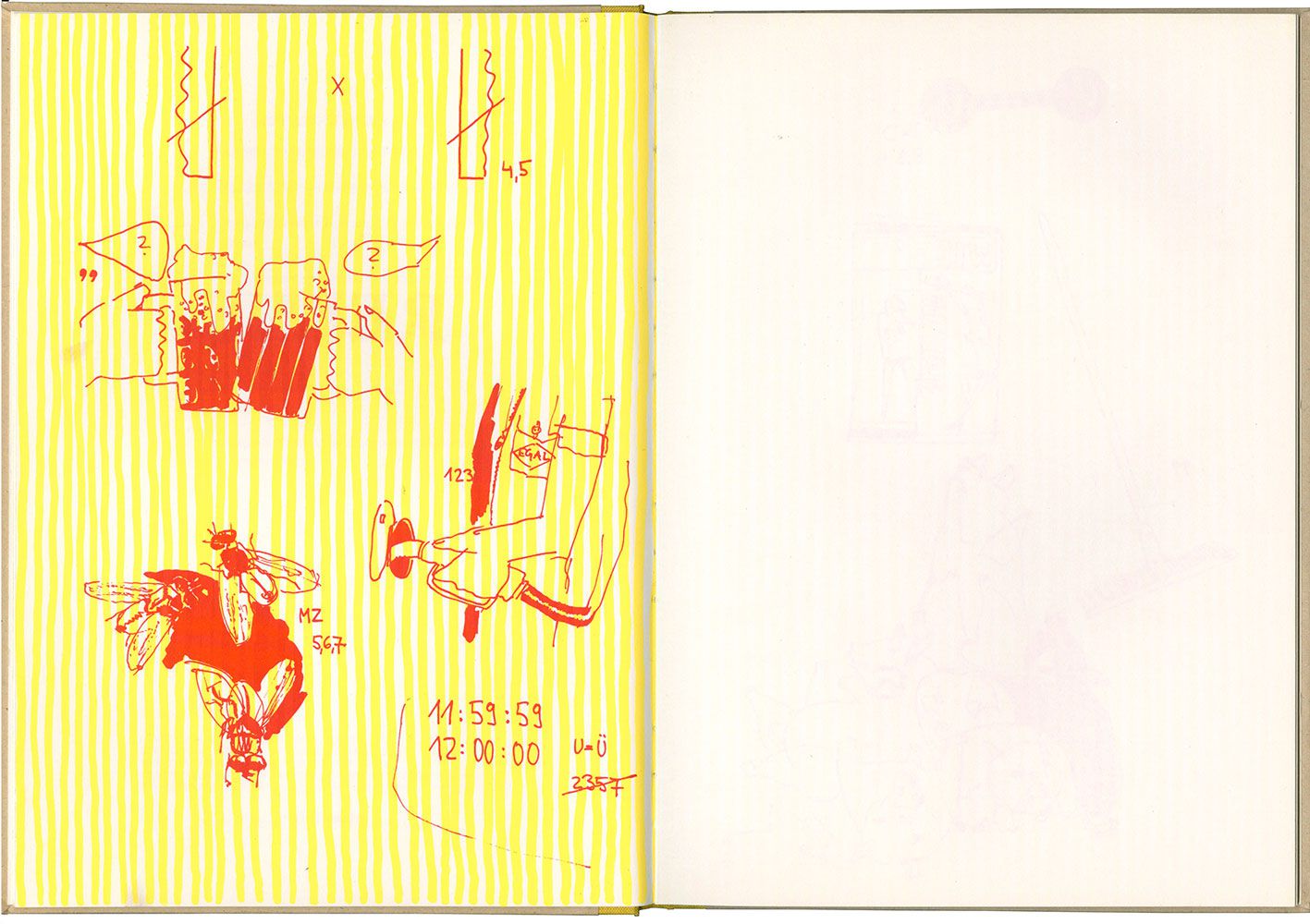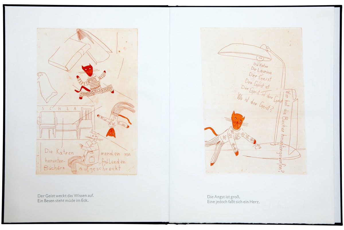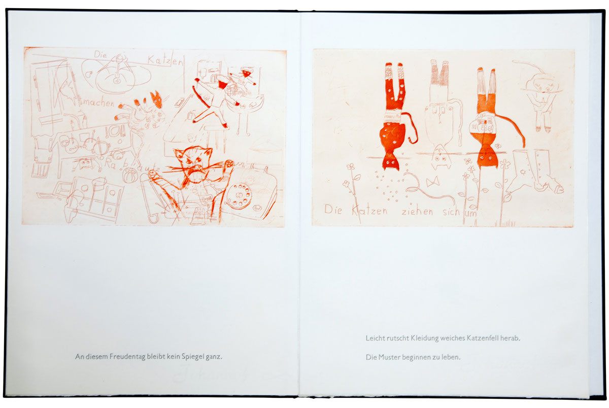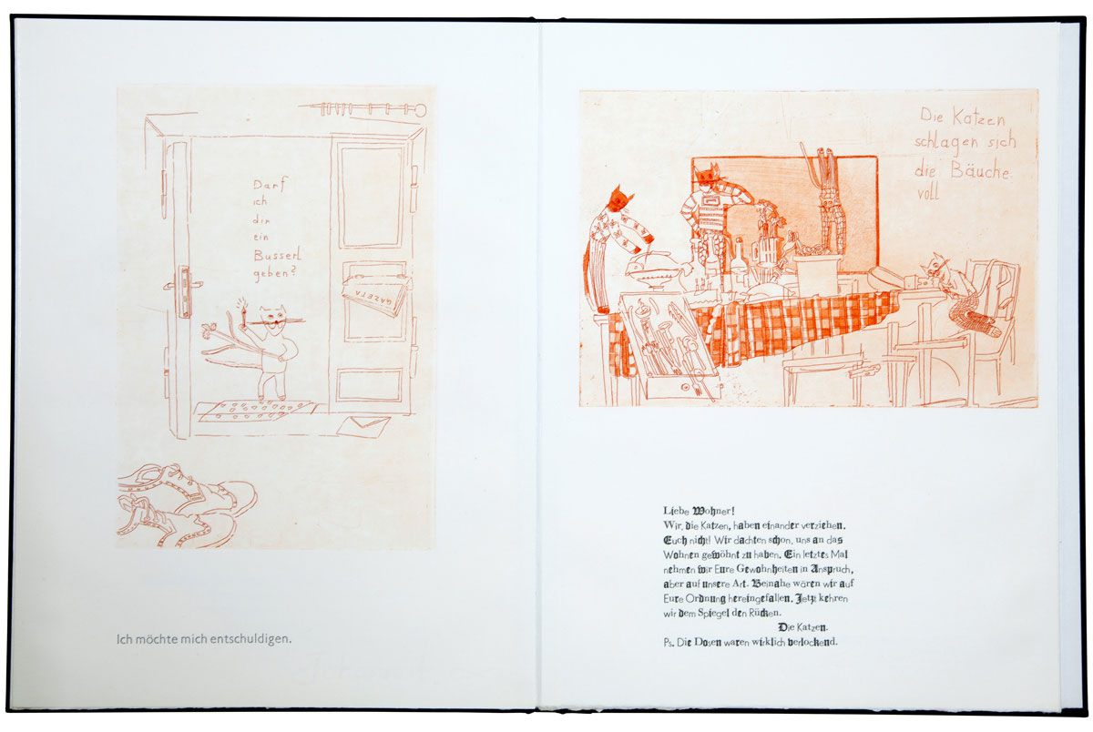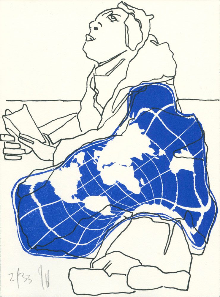 Zein Wigger hat auf diese Lithografie mit Zeichnungen reagiert, die im weiteren als Siebdruck über die Litographie gelegt wurden.