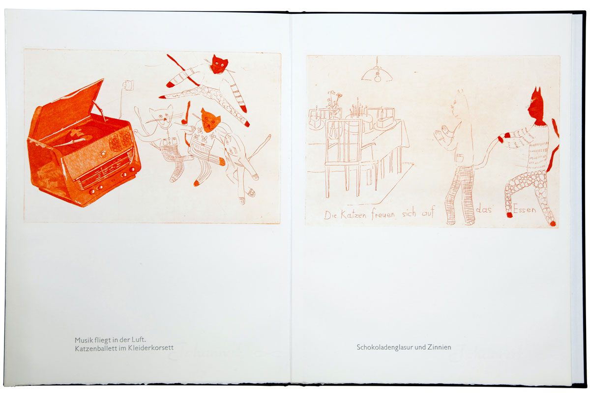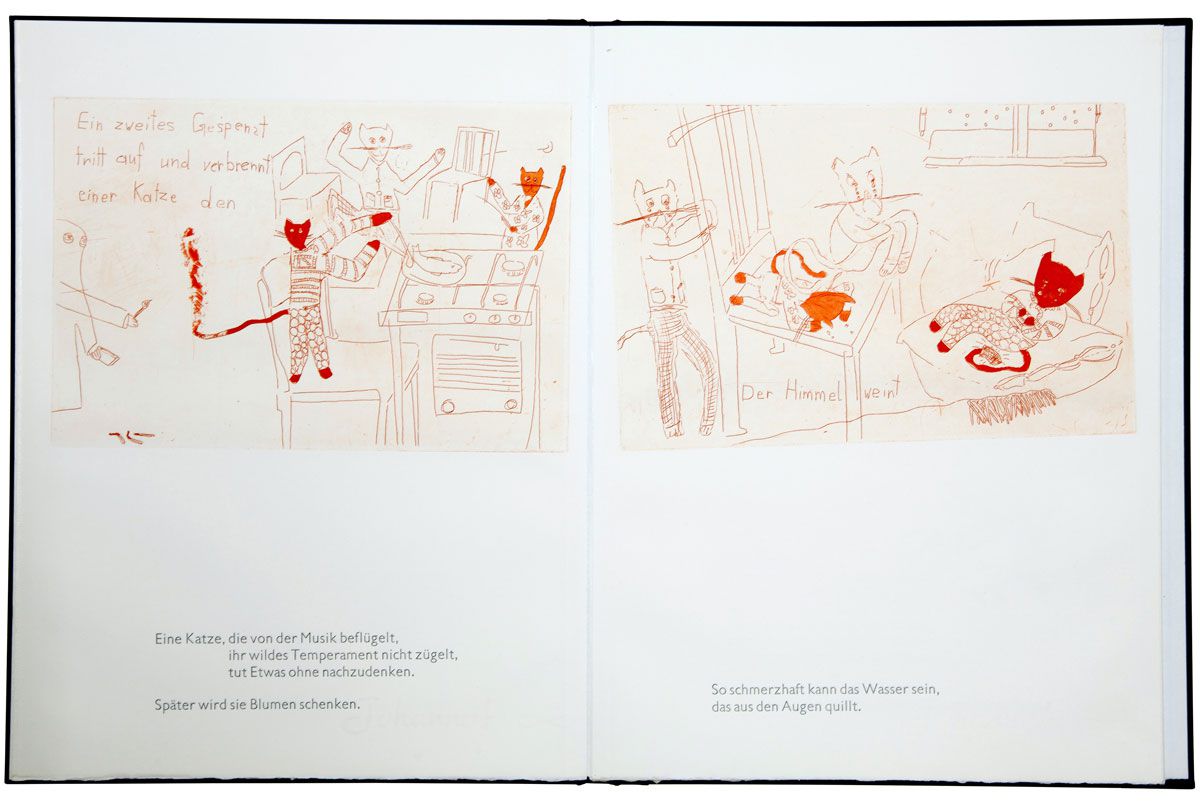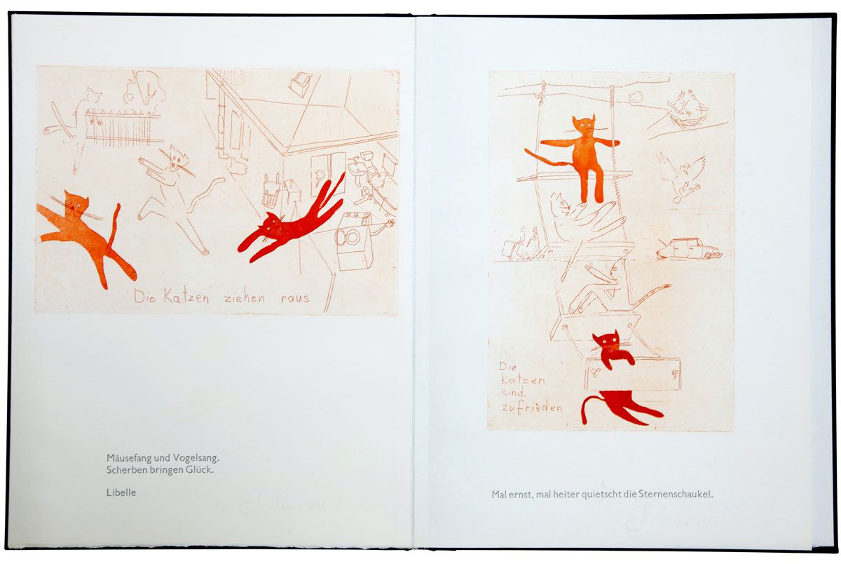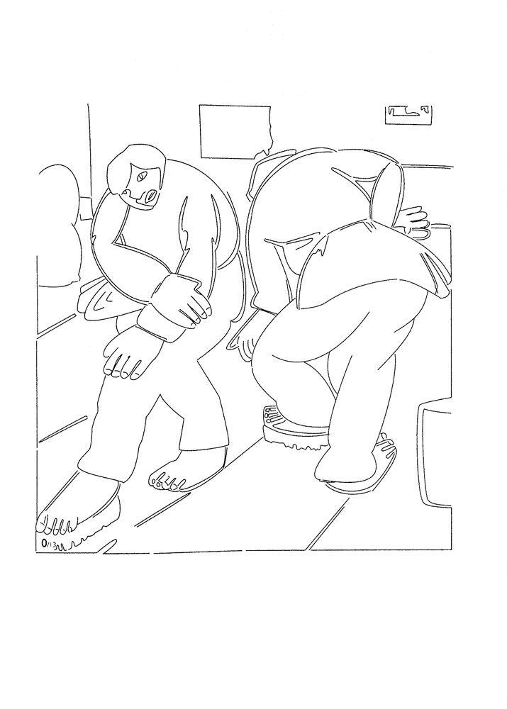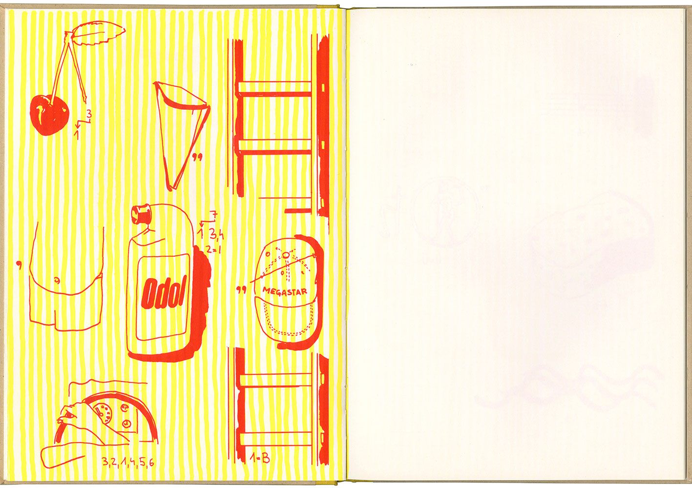 Zein Wigger hat auf diese Lithografie mit Zeichnungen reagiert, die im weiteren als Siebdruck über die Litographie gelegt wurden.