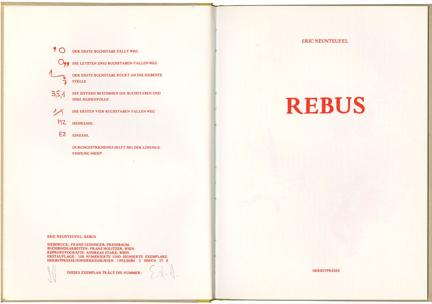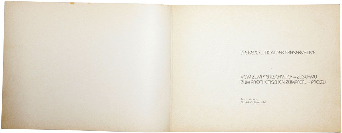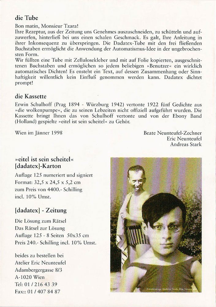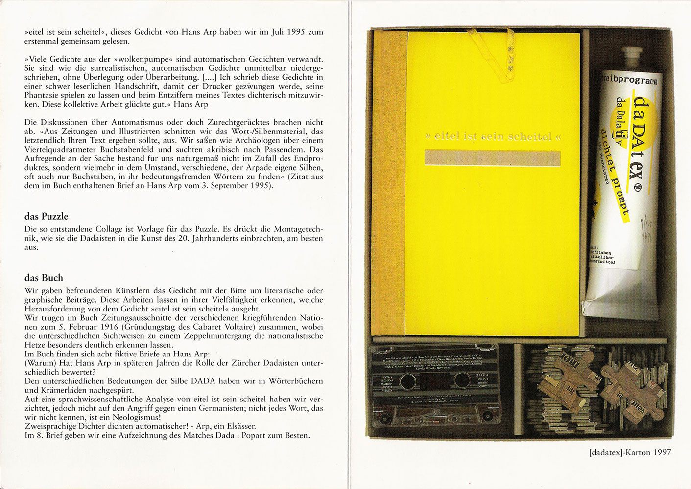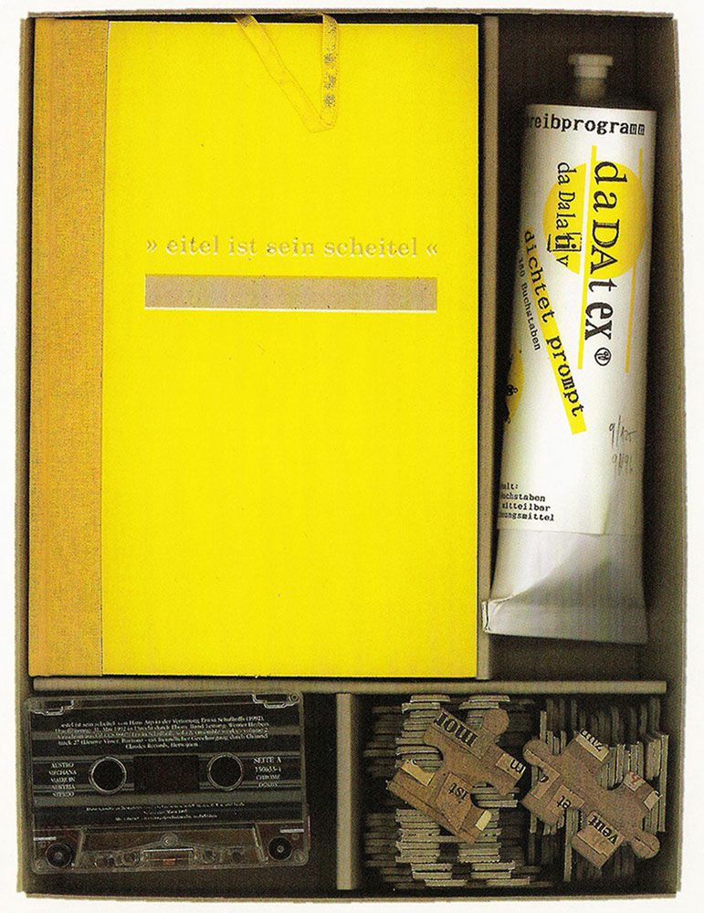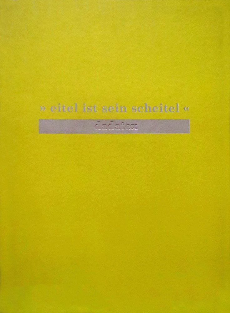 | (dadatex)-Karton "eitel ist sein scheitel" Eine Arbeit zur 17ten Arpade Hans Arps aus dem Gedichtband "Die Wolkenpumpe". Format: 32,5 x 24,5 x 5,2 cm Idee, Konzept und Ausführung: Eric Neunteufel Buchbindearbeiten: Franz Holitzer Mit Beiträgen von Rudolf Horaczek, Carlo Hufnagl, Gerhard Jaschke, Jürg Jegge, Joachim Kern, Andreas Leikauf, Eric Neunteufel, Beate Zechner, Erwin Puls, Andreas Stark € 320,- / Auflage: 125 nummeriert und signiert, realisiert 50 Stück, 1997 |