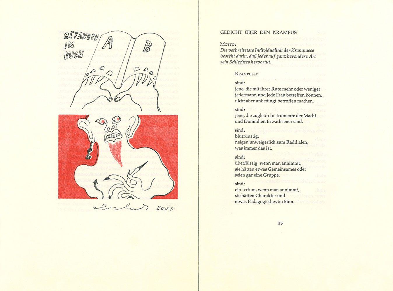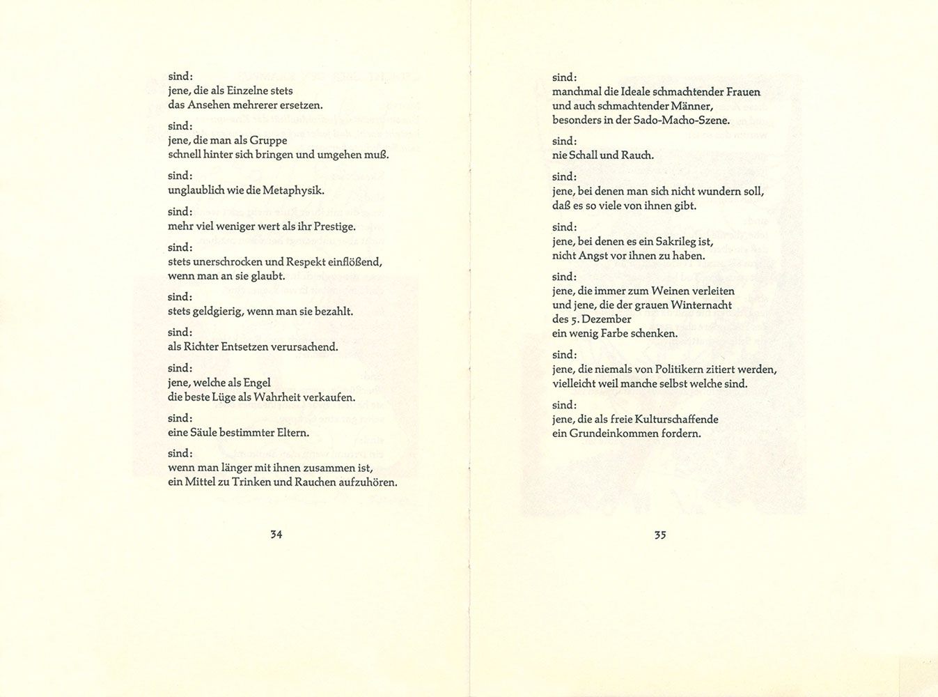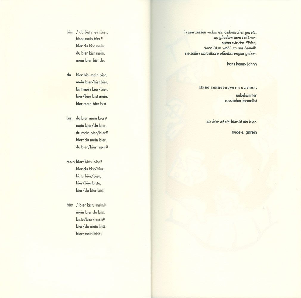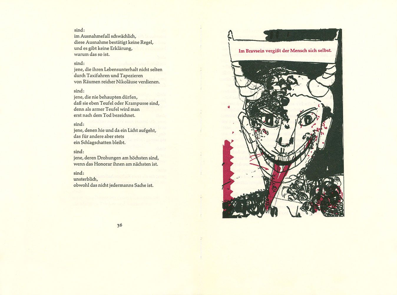 | (dadatex)-Karton "eitel ist sein scheitel" Eine Arbeit zur 17ten Arpade Hans Arps aus dem Gedichtband "Die Wolkenpumpe". Format: 32,5 x 24,5 x 5,2 cm Idee, Konzept und Ausführung: Eric Neunteufel Buchbindearbeiten: Franz Holitzer Mit Beiträgen von Rudolf Horaczek, Carlo Hufnagl, Gerhard Jaschke, Jürg Jegge, Joachim Kern, Andreas Leikauf, Eric Neunteufel, Beate Zechner, Erwin Puls, Andreas Stark € 320,- / Auflage: 125 nummeriert und signiert, realisiert 50 Stück, 1997 |